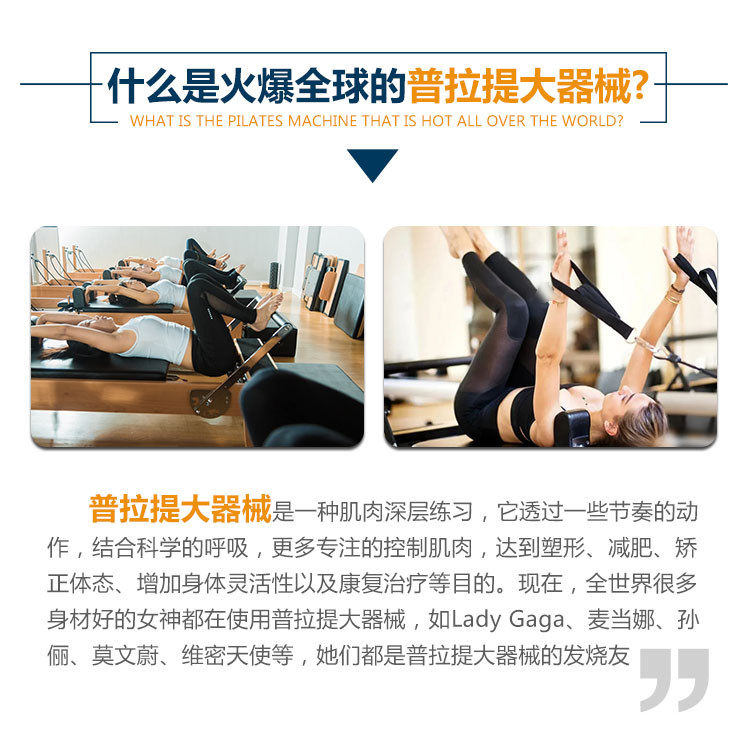 Reformer(普拉提核心床)是件“神器”,由普拉提先生发明 ,主要由床架、滑车、弹簧、脚杆脚带等组成。Reformer的 最大的优点就是多功能,通过滑车推车,或者对抗弹簧阻力保持 滑车静止,可以改善身体中轴延伸、力量、柔韧性和平衡性。只 用Reformer这一件器械,就可以有无数种的练习方法,动态 的训练身体每一个部分。Reformer练习不仅可以提高你的整 体力量,柔韧性,协调性和平衡性等,而且还可以改善你的身体 姿态,舒缓身体不平衡引起的各种疼痛。